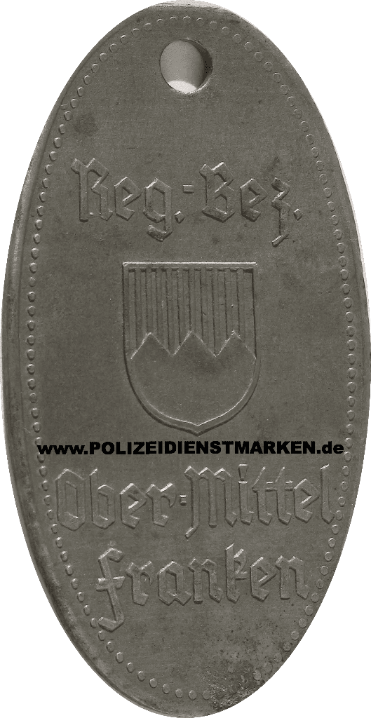 Diese Dienstmarke der Schutzpolizei wurde getragen von 1945 bis zur Verstaatlichung am 01.10.1971, zu diesem Zeitpunkt hatte die Stadtpolizei Bamberg 184 Beamte