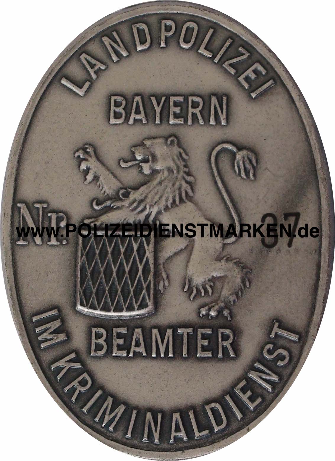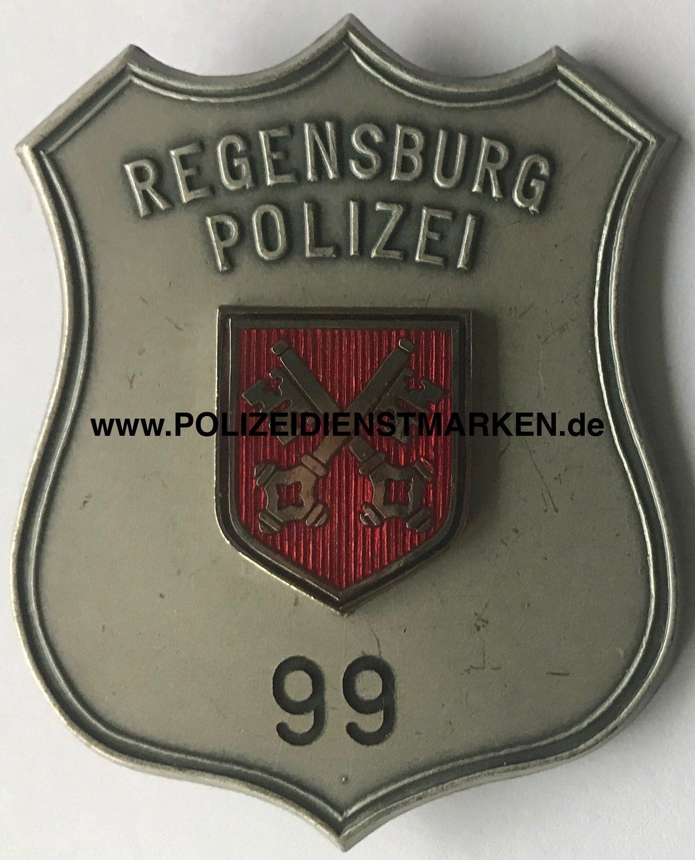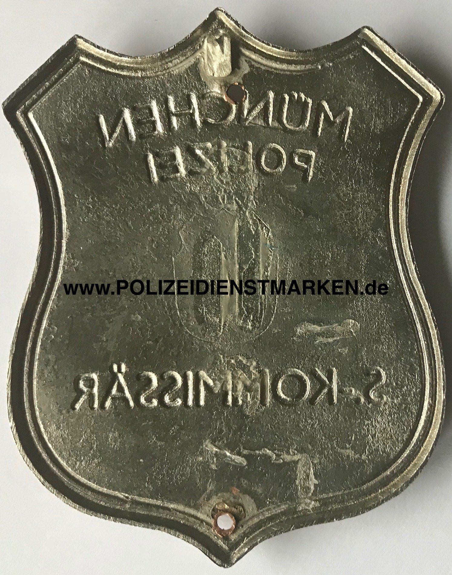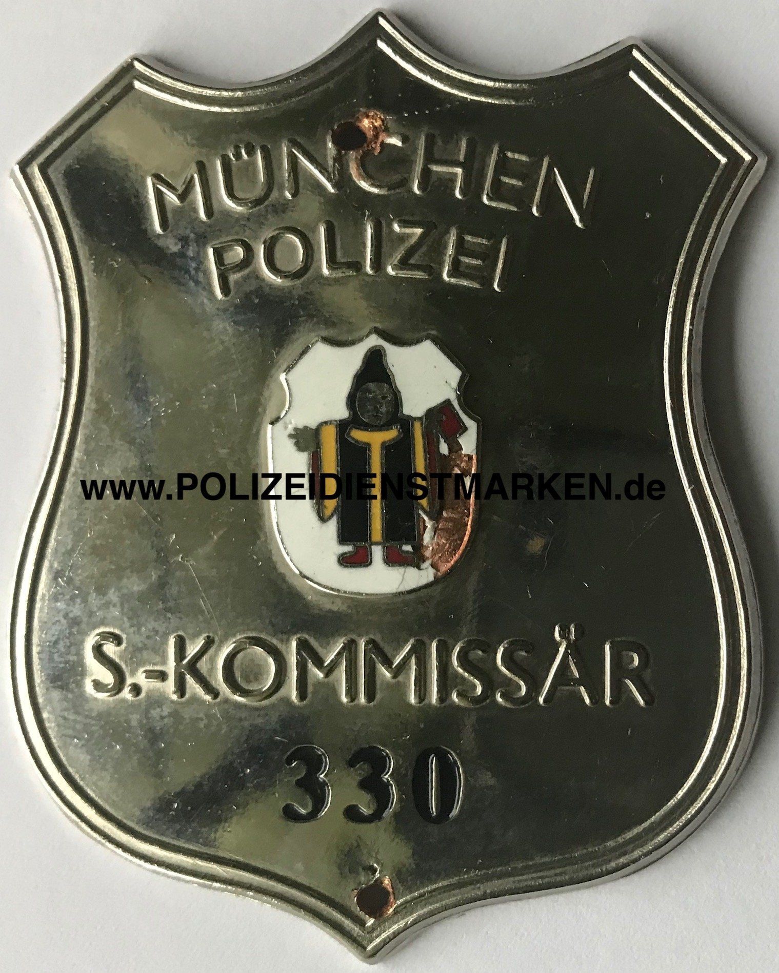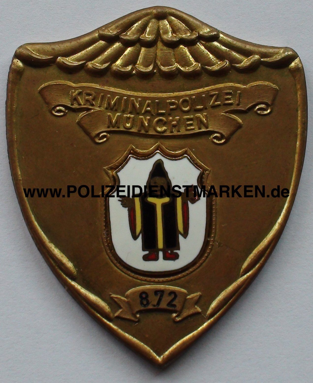 emailliertes Stadtwappen „Münchner Kindl“ und Dienstnummer auf der Vorderseite